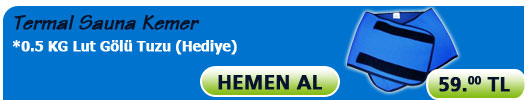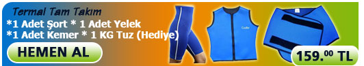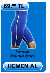 Termal Þort Termal þort diz kapaklarýndan baþlayýp göðüs altýna kadar kapsar. Yüzde yüz neoprenden imal edilmiþtir. Etki alanlarý üst bacak, basen, kalça, göbek, mide ve bel bölgelerindeki yaðlanmayý termal tuz kullanýmý ile birlikte kýsa sürede 10cm'ye kadar incelmeye yardýmcý olur. Termal Yelek Termal yelek, önden fermuarlý oldukça ergonomik ve þýk bir üründür. Etki alanlarý sýrt bölgesindeki yaðlanmalar, koltuk altý yaðlanmalarý ve göðüslerdeki yaðlanmayý gideren, iri göðüsleri dahi küçültebilen yine termal tuz kullanýmý ile birlikte kýsa sürede 10cm'ye kadar incelmeye yardýmcý olur. Termal Kemer Termal kemer, cýrt cýrtlý olup olabildiðince ergonomik ve þýk üründür. Etki alaný bel ve göbek çevresindeki yaðlanma bölgeleridir. Aruz edilmesi halinde Termal Tuz Ýle beraberinde kullanýlabilmektedir. Yýkama Talimatý Ilýk su ve beyaz sabun ile elde yýkanýr. Açýk havada asarak kurutulur. Kesinlikle çýplak radyatör üzerinde ve soba üzerinde kurutmayýnýz. Kullaným Þekli Haftada 3 gün (gün aþýrý) 1 tatlý kaþýðý Termal Tuz®'u yarým bardak ýlýk suda eriterek vücudun problemli yerlerine oval hareketlerle sürüp (en az beþ dakika) kurumasýný bekledikten sonra üzerine Termal Sauna Þort ve Termal Sauna Yelek uygulamak gerekir. Termal Tuz® vücutta maksimum 4 saat kalabilir. Uygulamanýn sonunda mutlaka duþ alýnmalýdýr